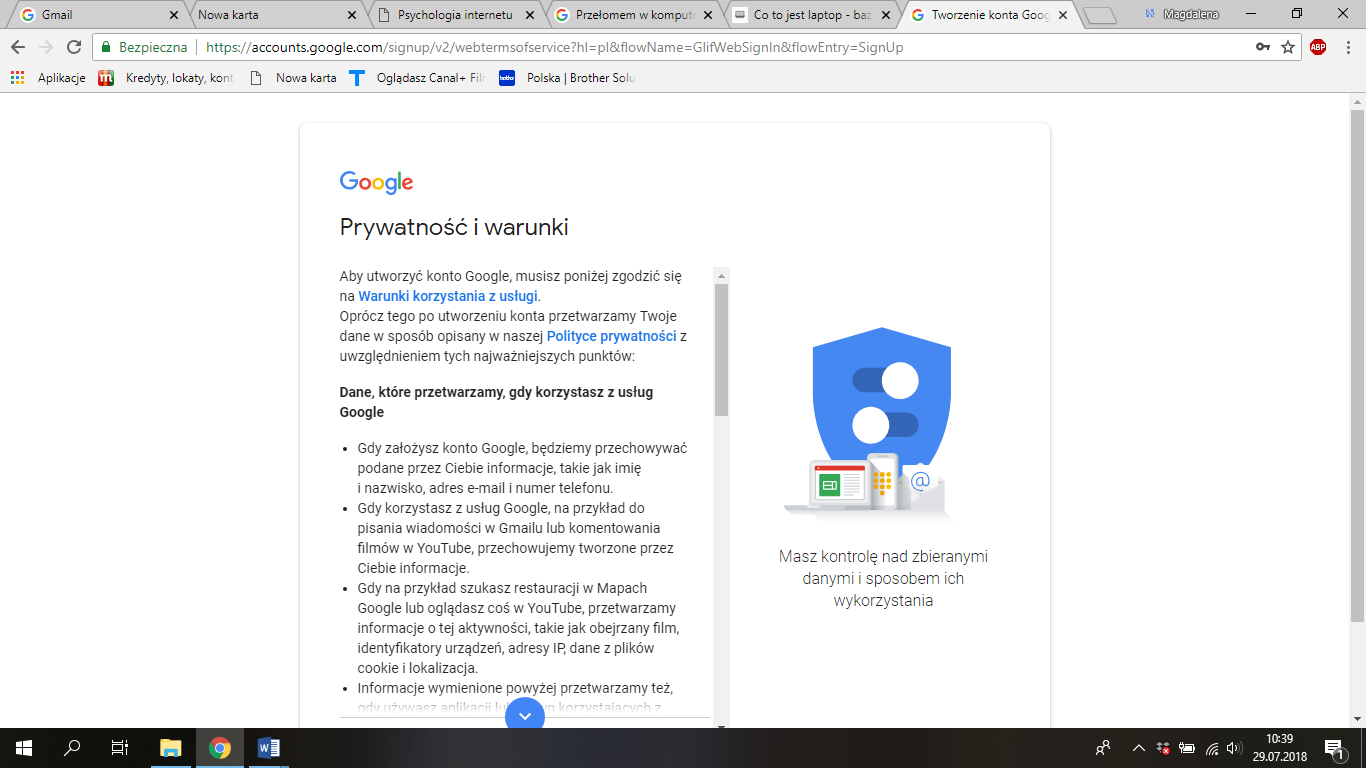 - - W kolejnym kroku musimy zaakceptować warunki użytkowania konta Gmail.