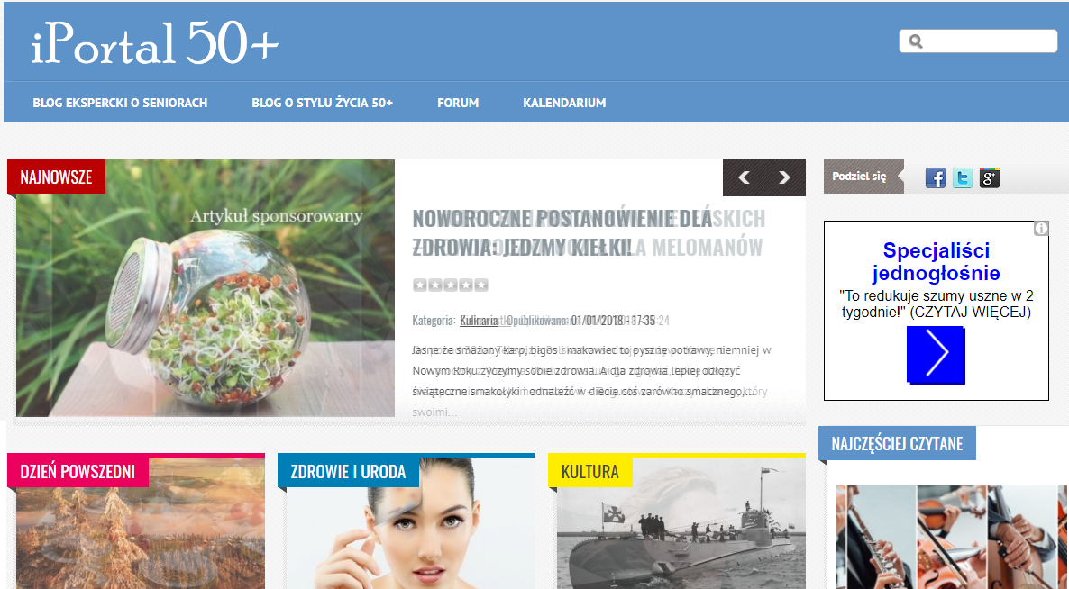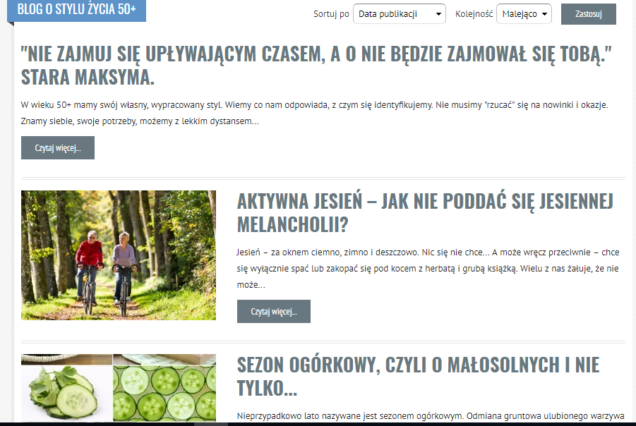 - strona poświęcona blogom eksperckim, jest to blogo stylu życia osób w wieku 50+, oraz forum które służy do wymiany informacjii poglądów z seniorami, na stronie znajduje się kalendarz wydarzeń, mogą one zainteresować seniorów.